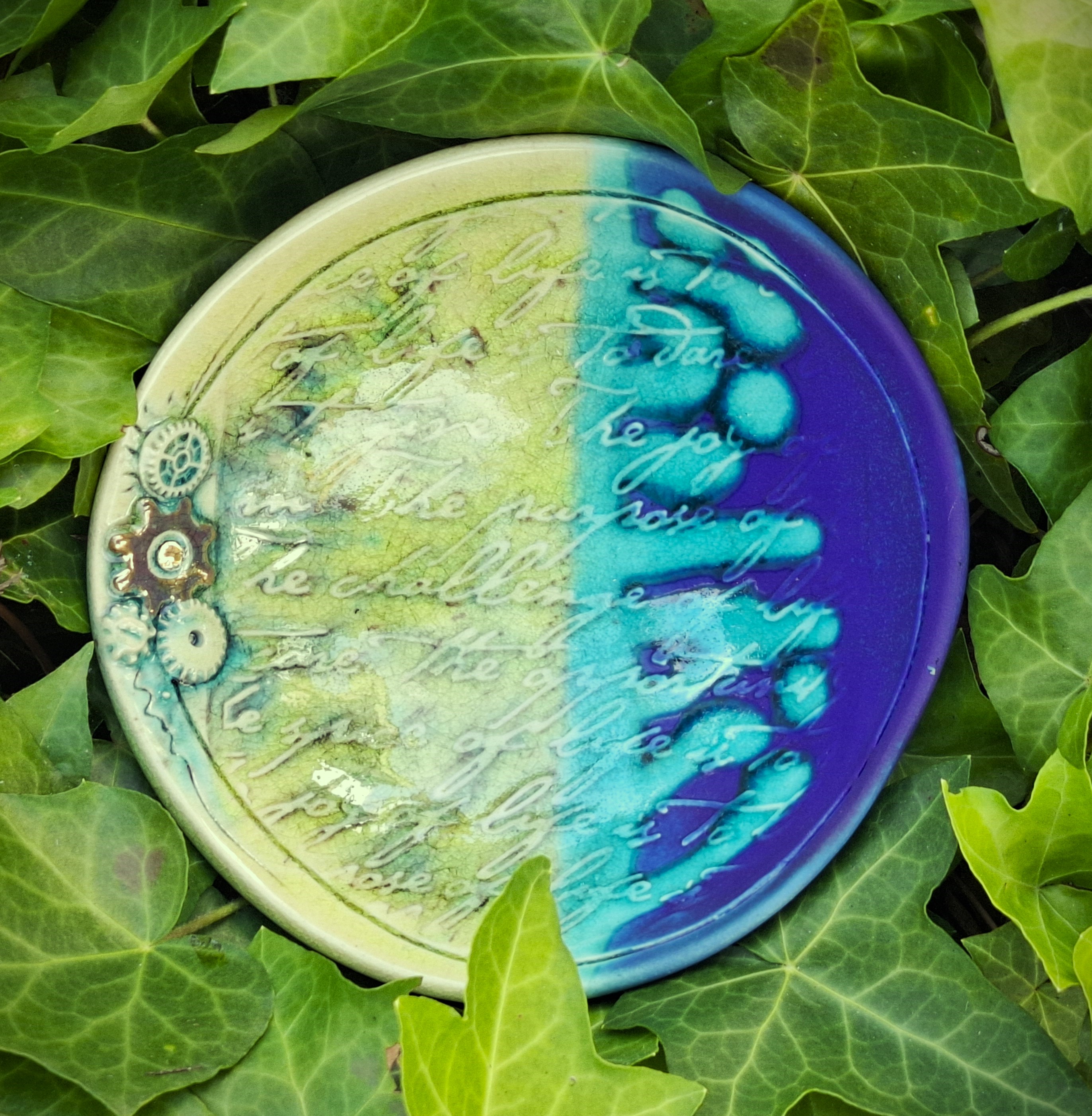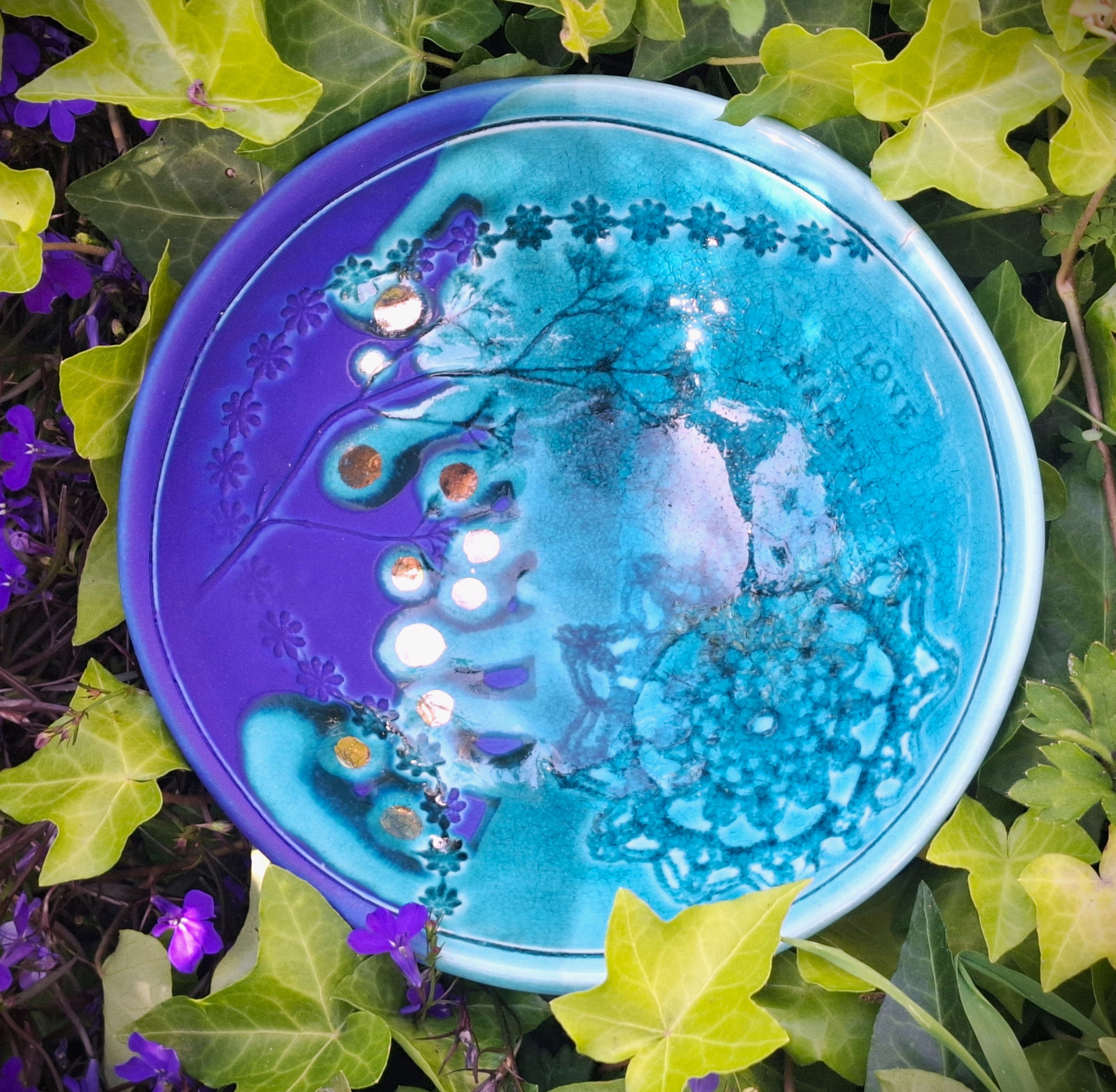Beautiful Love Bowl in my purple and turquoise dry glaze and embellished with gold. 18cm across