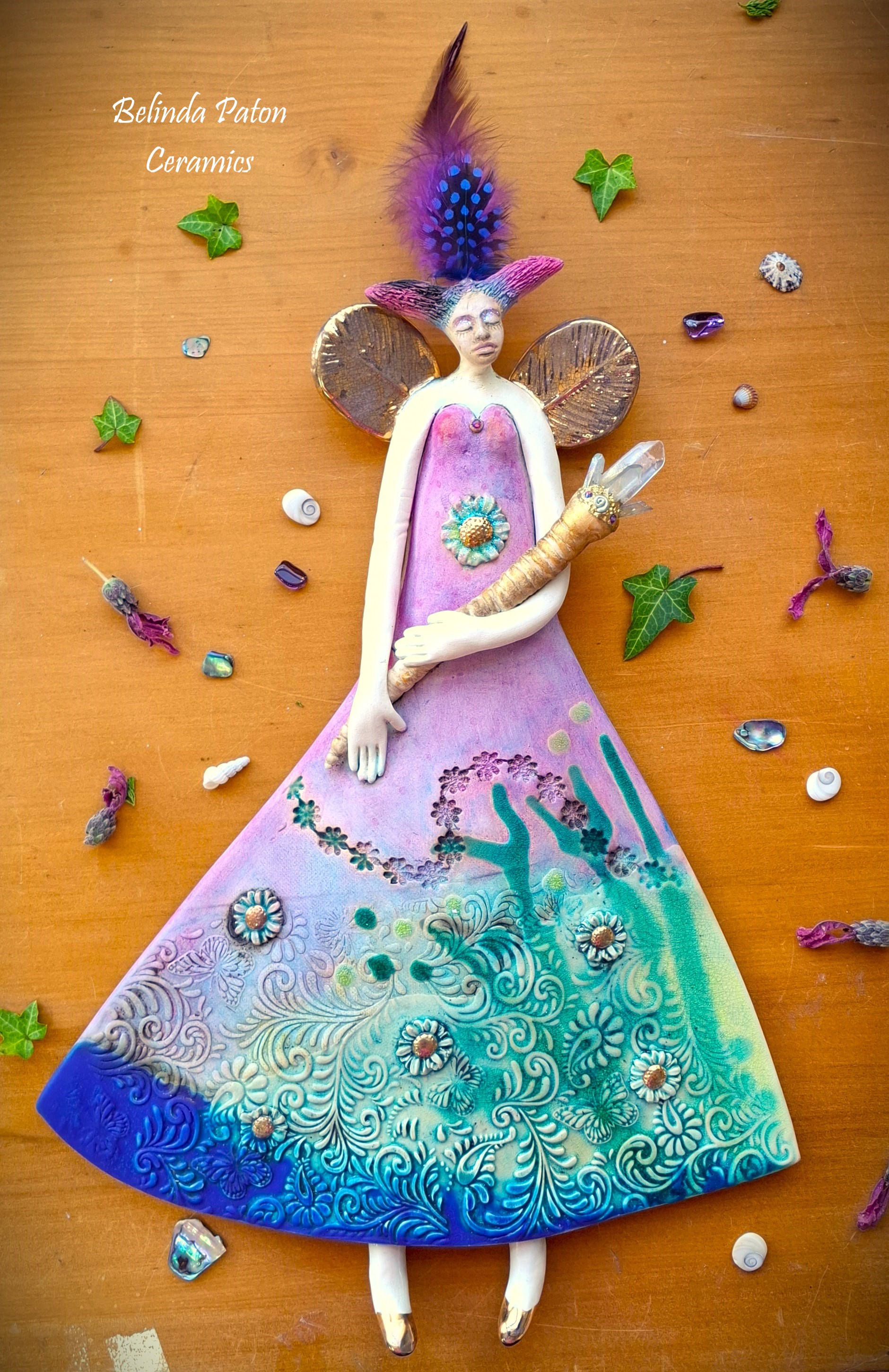 Beautiful bright purple and turquoise “Flying Fairy”. She has gold highlights and shoes and iridescent green leaf wings with a heart on her dress. She is 35cm long and hangs on the wall.