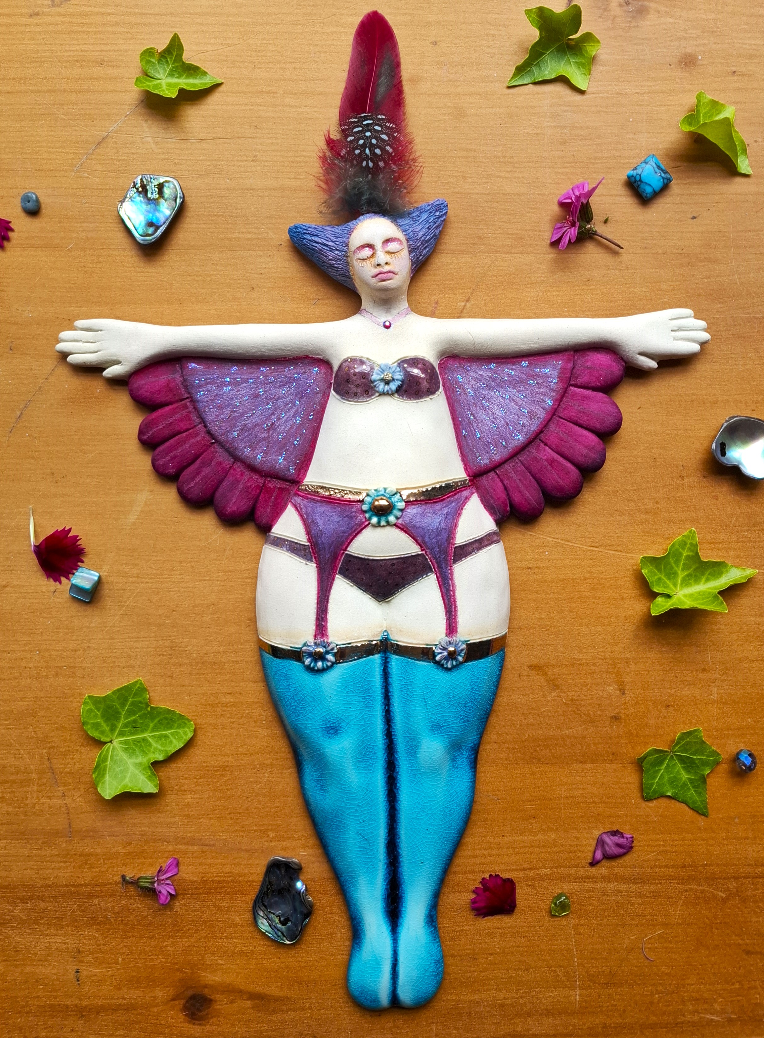 In her gorgeous scarlet and lilac lingerie! She has mauve and scarlet wings and metallic gold highlights. Her blue/purple hair is topped with a luscious magenta feather. She is 27cm tall not including her feather