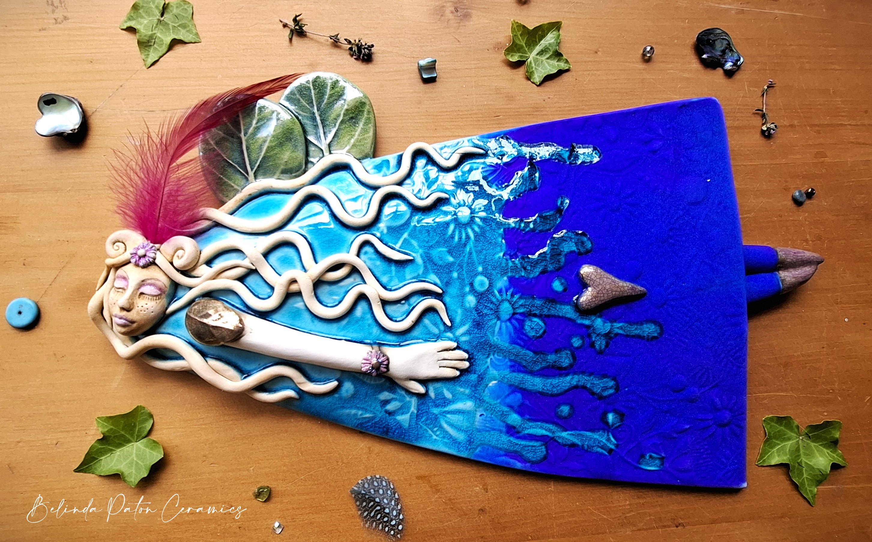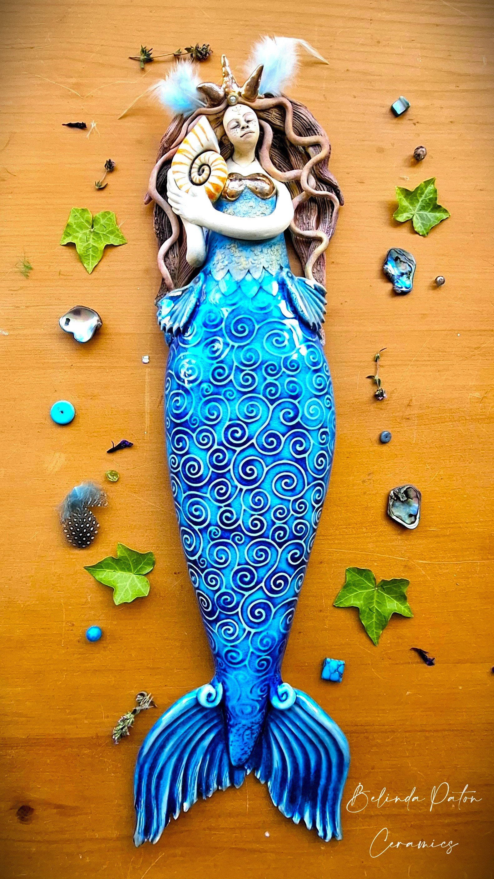 This beautiful mermaid has a two tone bright turquoise and cobalt blue tail with mother of pearl lustre on her fins and is listening to a nautilus shell. She has metallic gold lustre highlights on her crown and bodice as well as feathers and sparkles. She is a stunning piece and measures in at 45cm all.
