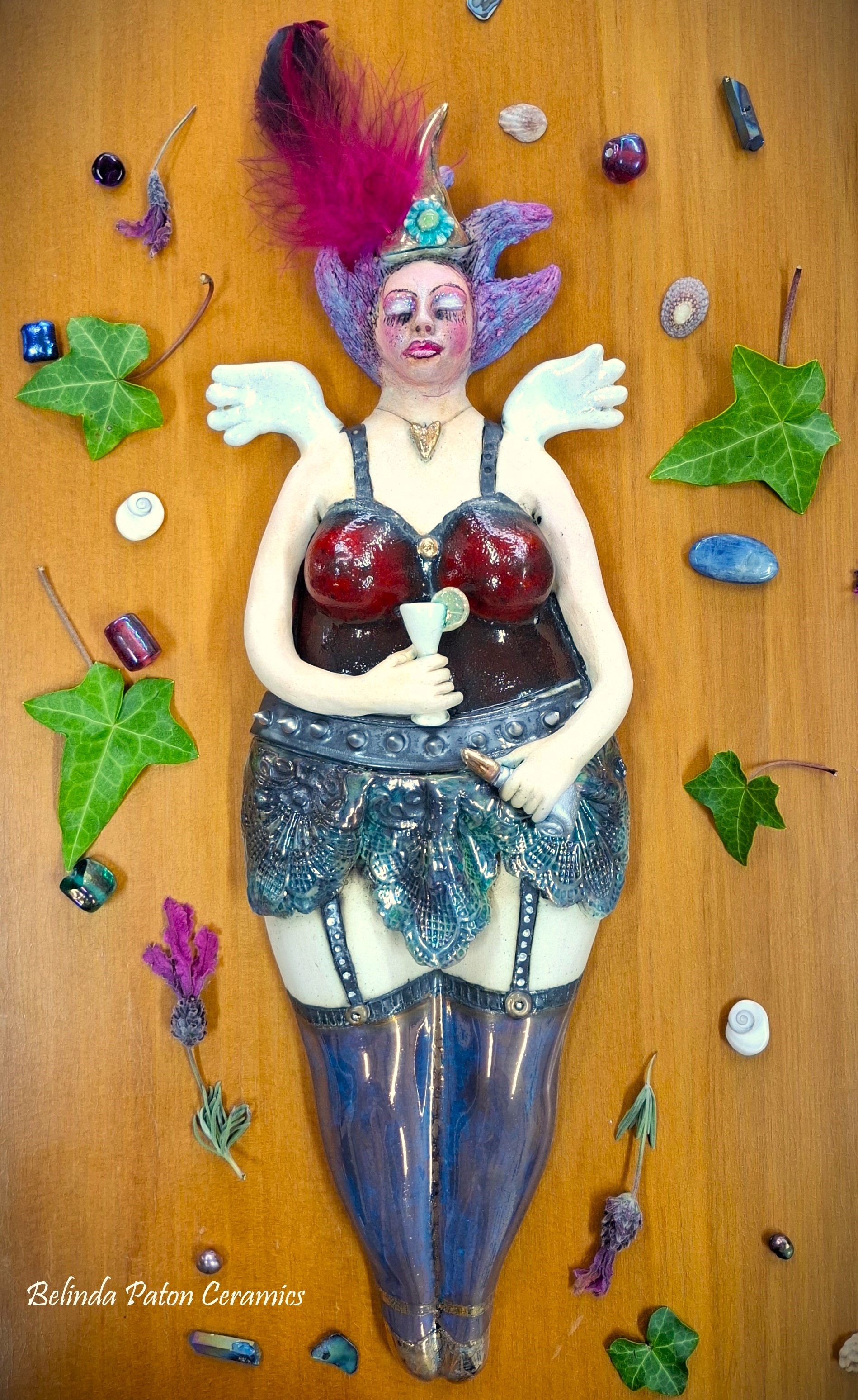 One from my “Fat Tarts” series! She is sporting a lava red corset and a metallic lace skirt with a silver studded belt. She has golden stockings on and is holding a cocktail. She has a magenta feather in her magenta hair and sparkly white wings. 36cm tall