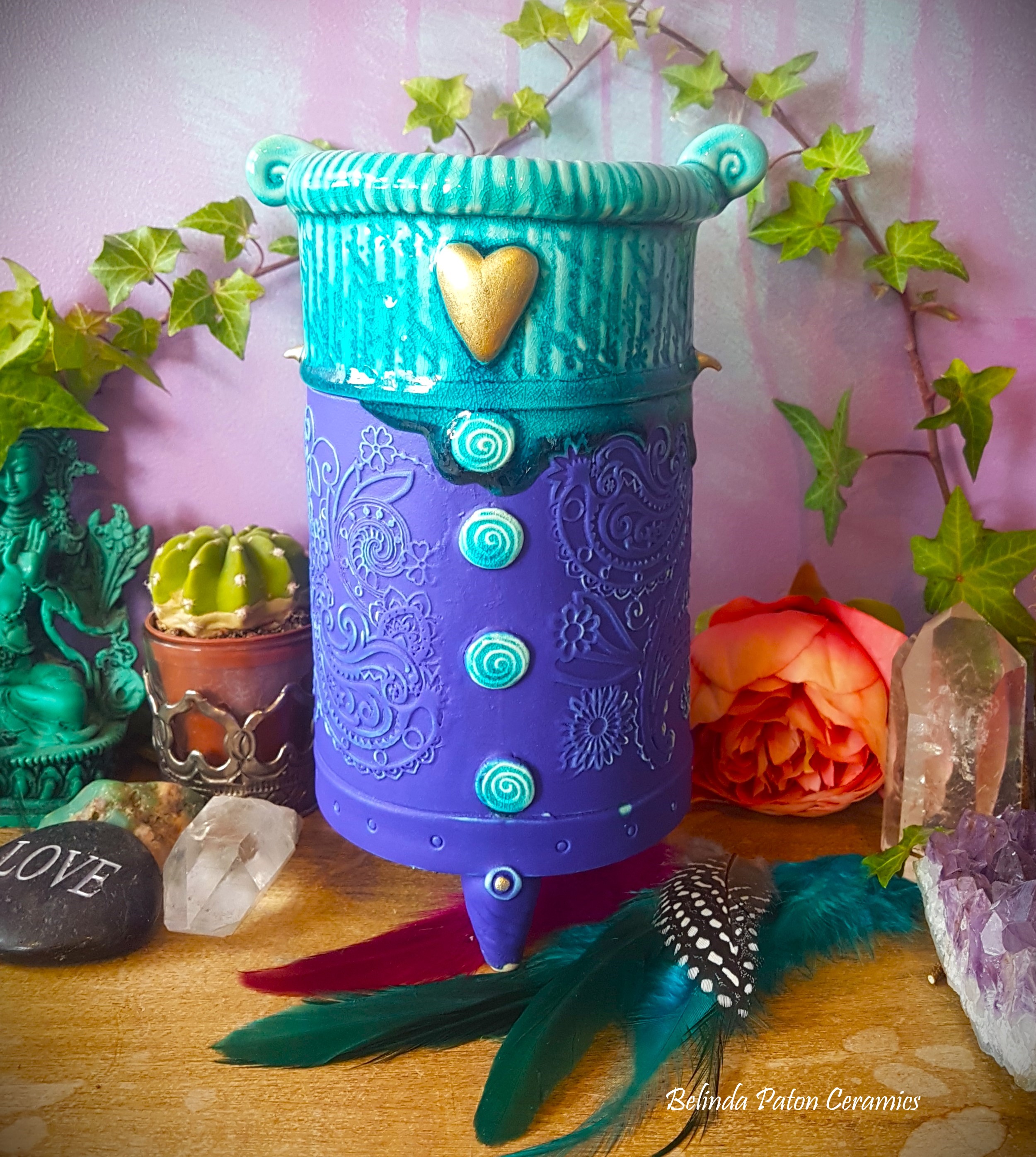 This beautiful “Heart Pot” is glazed in my glossy bright turquoise and bright matt purple glazes with gold highlights and has buttons down the front. 22cm tall.